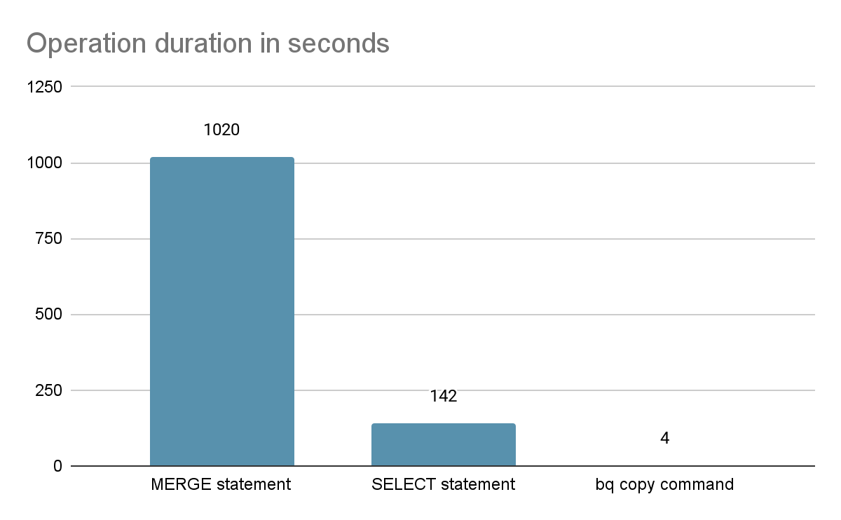 Of course, the MERGE statement offers much more flexibility than a WRITE_TRUNCATE query. Yet in most analytics workload cases, the queries are time series that are immutable - and therefore, either the destination partition is empty or we’ll likely have to reprocess a partial period so that it translates into overwriting every row in a subset of the existing partitions.